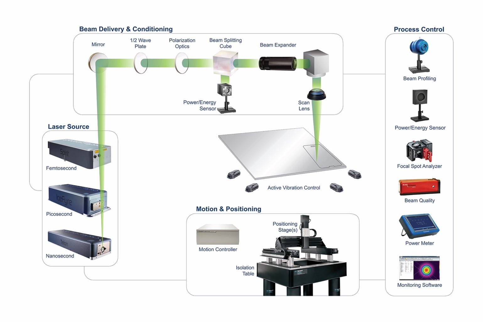 Figure 1. Newport, Ophir, and Spectra-Physics are part of the MKS Instruments strategy to Surround the Workpiece®, an integrated system that incorporates product design and development; system-level integration; research and development; system, subsystem, and component selection; and maintenance, repair, and calibration services for laser-based guidance and control of manufacturing processes.